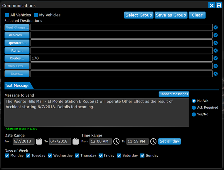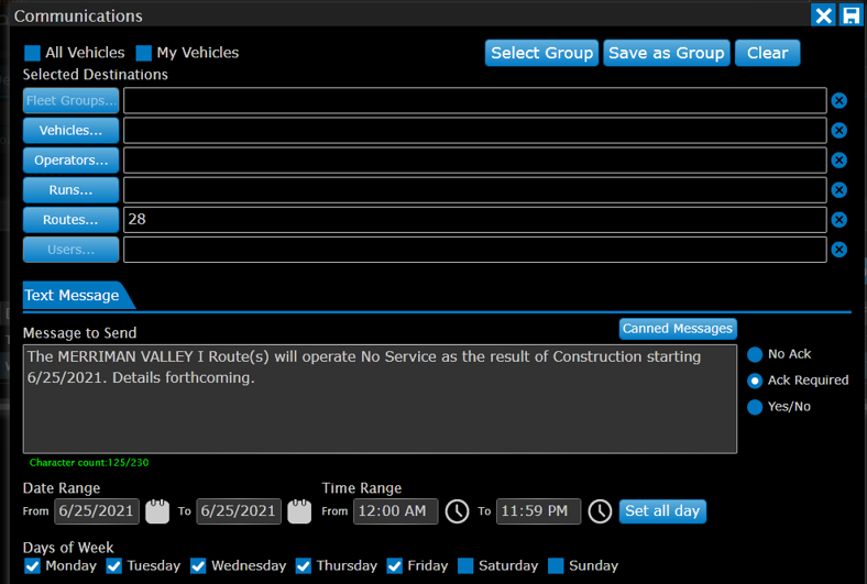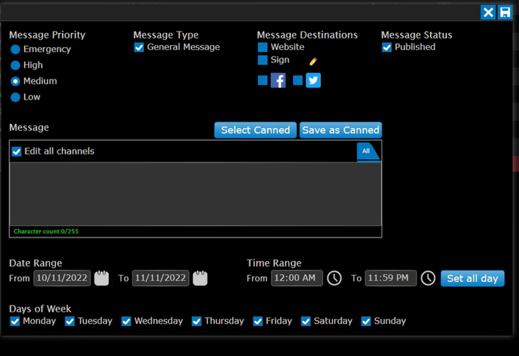 - By default, the Public Message Date and Time range match the Detour Date/Time Range, but you can set the Public Message range separately. For example, you might want to provide advanced notice of the detour in public You can also use the “Set all day” button to set the message time range for the entire day.