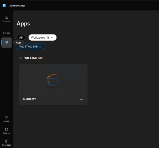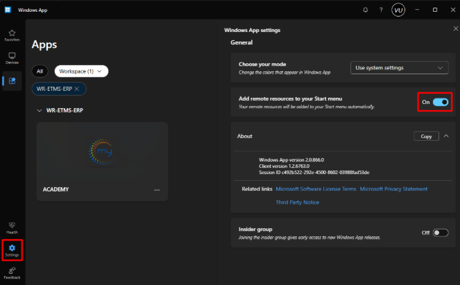 In Windows App, open Settings and enable "Add remote resources to your Start menu". This syncs ETMS into Start so you can search and launch it like a local app.