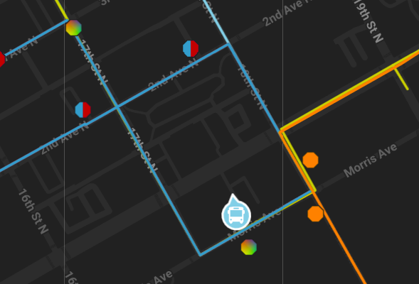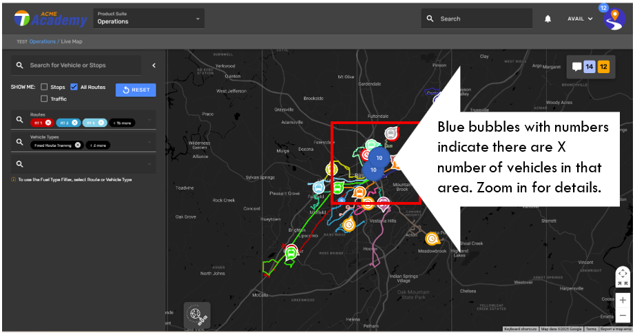 Bus Number Bubbles: If there are several vehicles in one spot, the map will show a bubble with the number on it indicating the number of vehicles clustered together in that location. This makes it easier to quickly see at-a-glance where there is a high density of vehicles in a particular location. Clicking on the icon quickly zooms into that area to view the individual vehicles' icons.