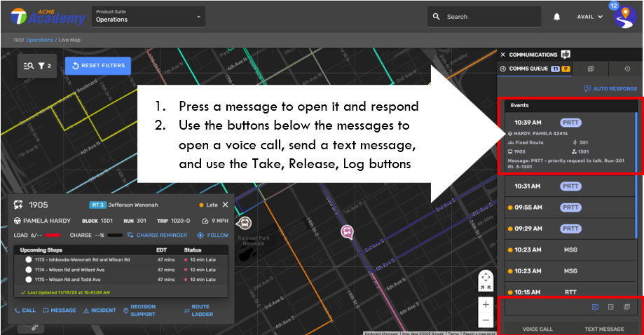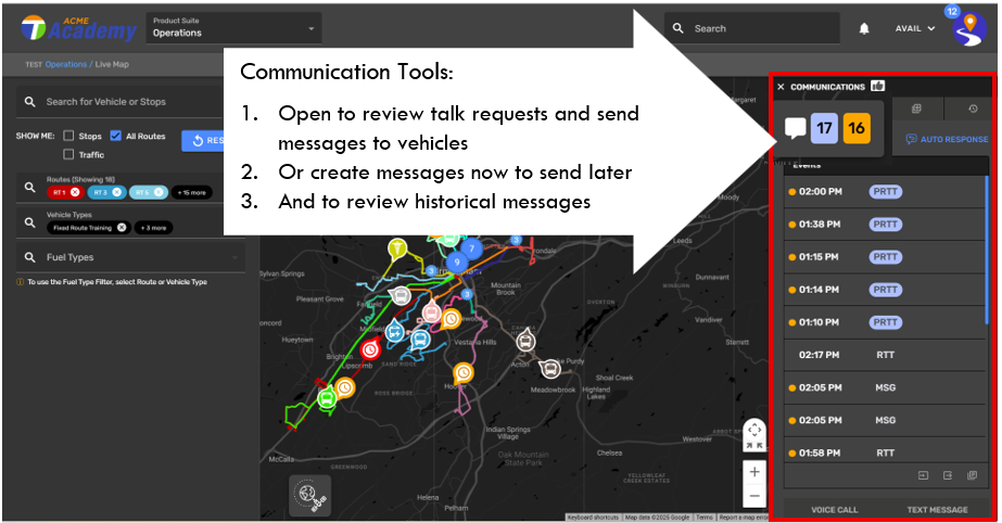 • Communication Tools: Use messaging features for VoIP, canned and data messages, closed and open mic functions with vehicle operators on the Vehicle Card or in the Communications panel.