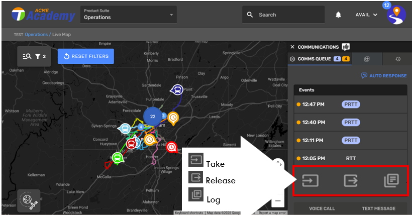 How do they work? Dispatchers use the Take, Release and Log buttons in the Communications panel to acknowledge and finalize communication events. These buttons are located near the bottom right of the Communication panel. These button features mimic the workflow used on the Operations Map, with a new look and feel.