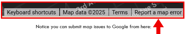 Submitting feedback to Google: Feature located near bottom right of map screen view