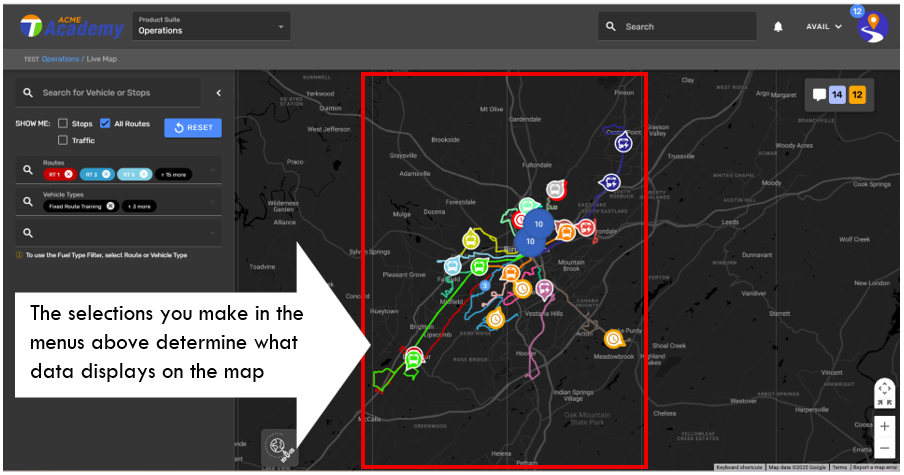 When you open Live Map, begin by using the menu on the left to populate the map with the routes and vehicles you plan to monitor.