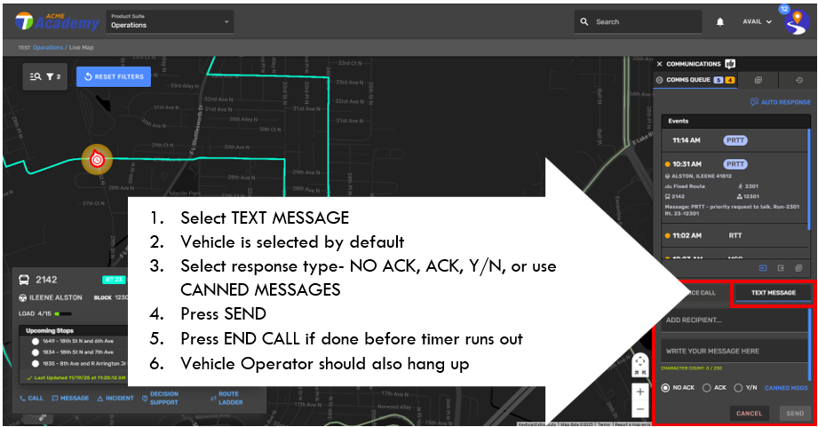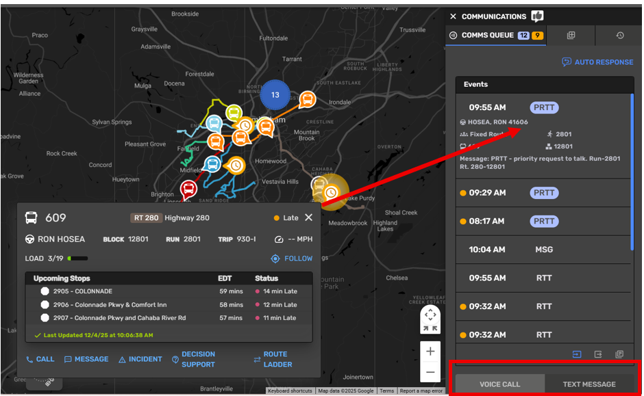 Or simply open a message in the queue, then use the built-in options to respond. We opened a PRTT message. The Vehicle Card displays for your reference, and the communication features display in the menu, as highlighted: Voice Call, Send Text.