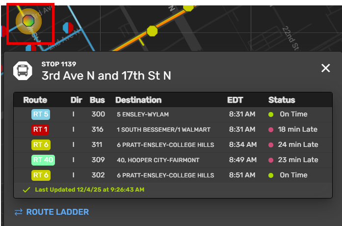 • Route Ladder: This built-in link allows you to review route level details, which is particularly helpful for monitoring headway service routes when vehicles are bunched or gapped.