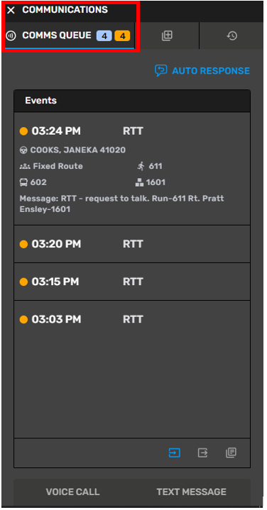 RTT messages are routine requests to talk to dispatch. These are lower priority messages when compared to PRTTs. Respond accordingly, using the similar workflow as for PRTT messages. Communications can be managed from the communications panel or from a vehicle card.