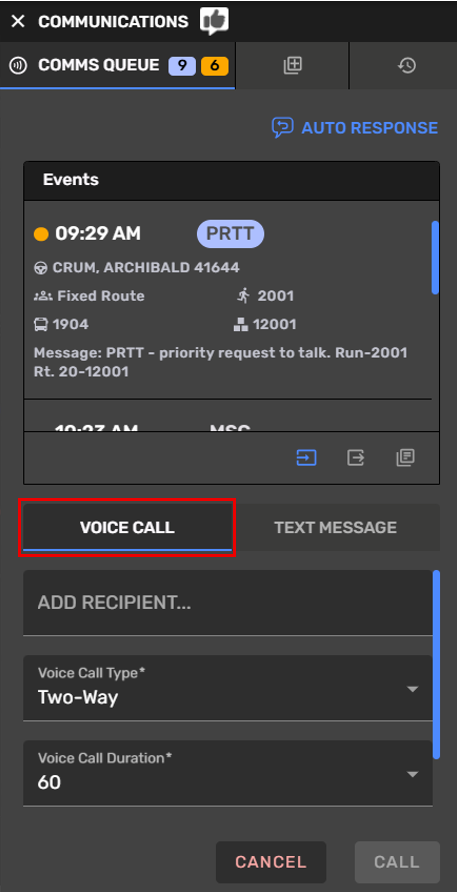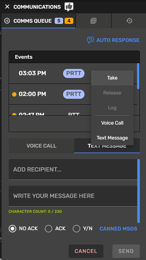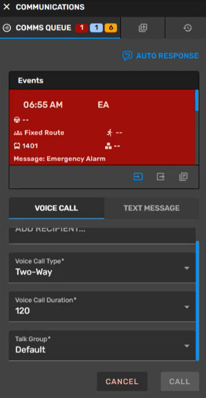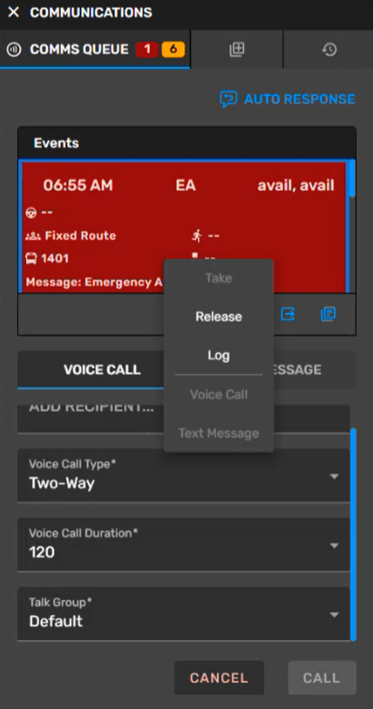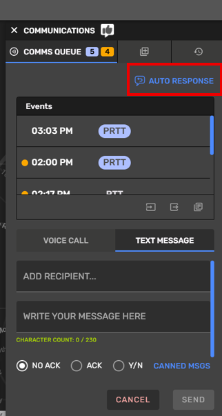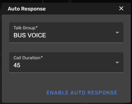 Do you use closed mic and need to step away from operations momentarily? The Auto Response link in the top right corner of the communications panel opens Auto Response and allows you to select the Talk Group and Call Duration and enable it. VoIP calls do not include a duration option.
