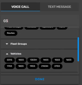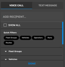 For the recipient there are several options to select from: fleet groups, vehicles, operators, runs, and routes. This gives you the ability to broadcast the call or text message to groups of recipients if necessary.