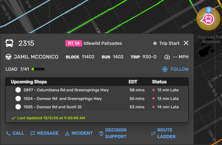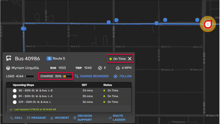 You can simply select a vehicle on the map to display its card. Each vehicle card will display varying information, based on the vehicle type, and service type: charge alerts, bus bunching/ gapping issues for headway routes, passenger load - use these prompts to assist you in determining any corrective actions needed to get service back on track. You'll also see the next three stops the vehicle is scheduled to service. EDT is the estimated departure time.