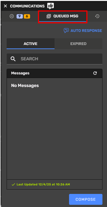 Clicking the Comms icon in the upper right opens the communications menu for use: Comms Queue, Queued Messages and Message History will display in separate tabs when opened.