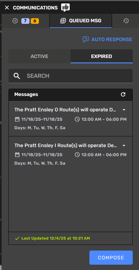 Queued Messages: These are messages that are queued to send later for a specific date/ time. The Active tab shows active queued messages and the Expired tab shows only expired messages. You can copy or edit messages here.