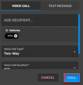 To place a voice call to the vehicle, use the Voice Call button to select one or two-way communications. One way calls are typically used to broadcast a message that doesn't require a response, two-way calls are for conversations. Select how long you want the line to be open for the call. Then choose the group for the call. When you press 'CALL', the call connects and you'll see the status of the connection. The time set for the call determines when the call will expire. Allow enough time when setting up the call to accommodate this. When the vehicle operator hangs up, the call to the vehicle is ended, opening the line for any other calls you need to make.