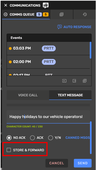 IMPORTANT: When you are the only one monitoring specific fleet groups, and you need to leave your station, set your dispatch station to auto-response mode so you can still respond to vehicles that send an RTT or PRTT, to avoid losing sight of important communications (EAs).