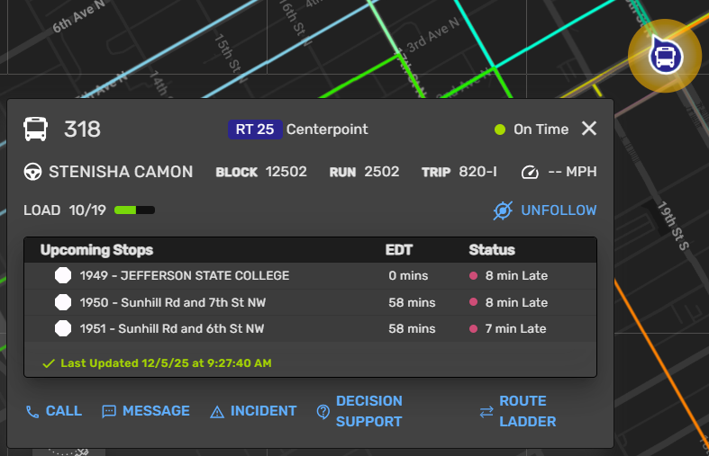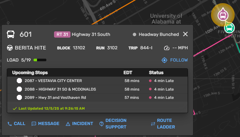 Route Ladder tools are easily accessible on each Vehicle card for ease. When you select this option, the Route Ladder will open. This is useful for reviewing route level vehicle details, or issues such as bus bunching/ gapping issues for headway routes. For more information about using Route Ladder, select the following link: Route Ladder