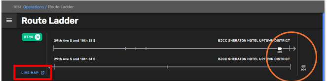 Example - Vehicles 604 and 605 are too close together on route 90. Notice the link to go back to Live Map.