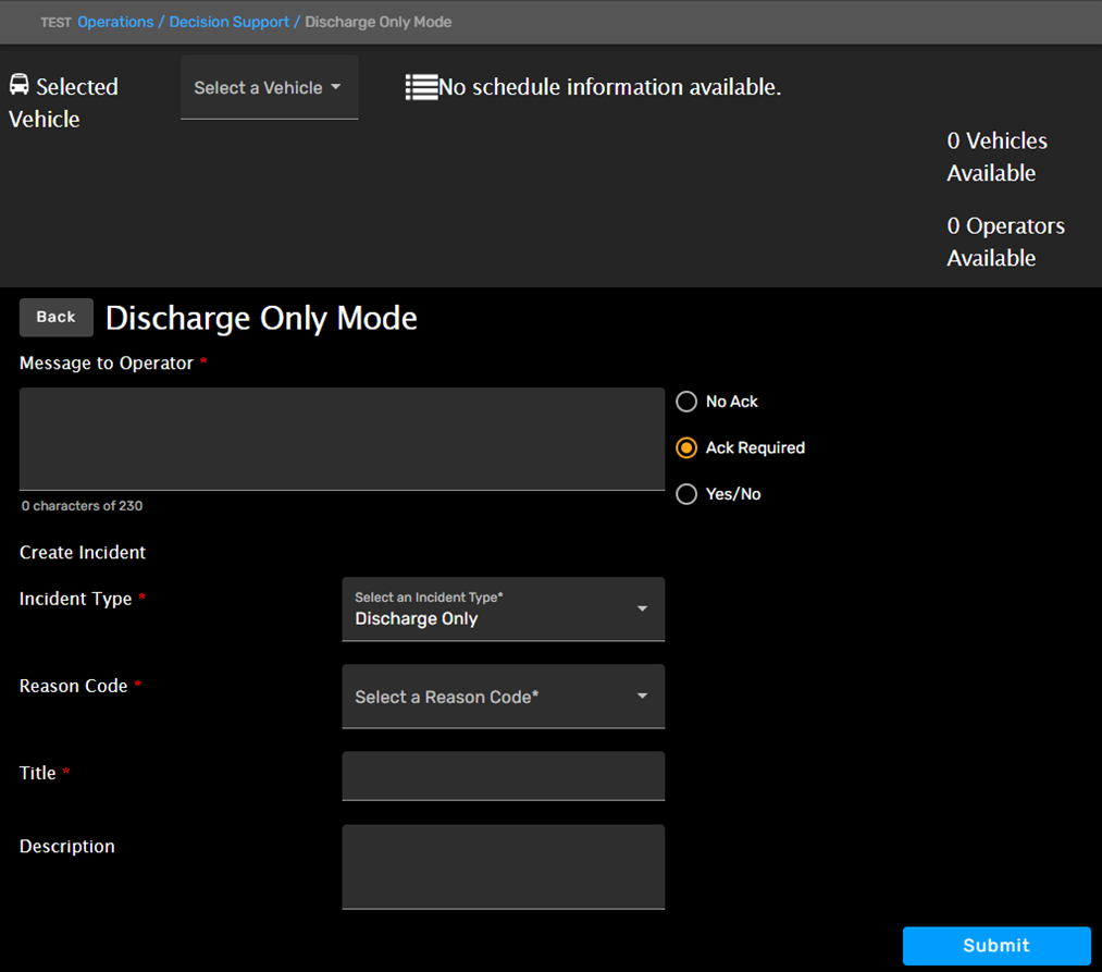 Message to Operator: Enter a message to the vehicle that you are requesting to enter discharge only mode. Make sure to select either No Ack, Ack Required, or Yes/No so you can see the operator’s response to the message.