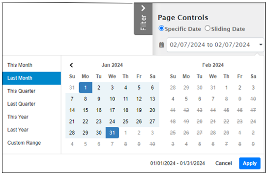 This report displays data from the previous day. Use the filter to adjust the range. For example, if you want to review information for a larger period of time, open the filter and adjust the dates. The example below illustrates filtering for the month of January: