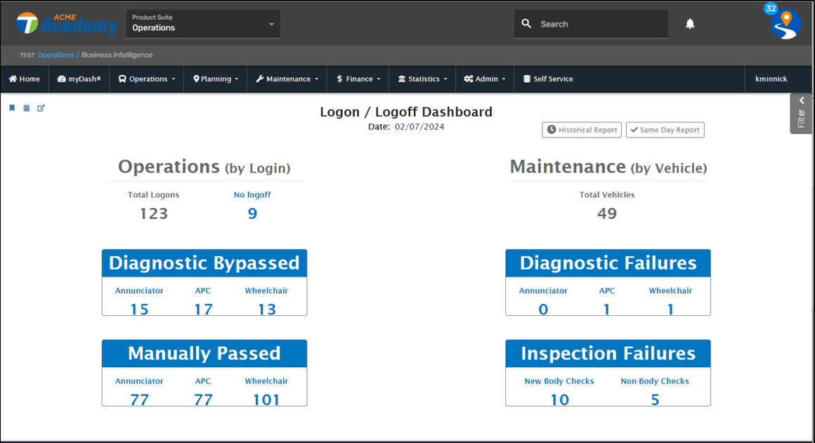Use the Logon/Logoff Dashboard report to identify issues related to a vehicle operator's workflow; these may include pretrip failures, manual passes ( manual pass indicates the vehicle operator did not perform the test but passed it as working), annunciator failures, APC failures, wheelchair ramp failures, camera system failures, and DVIR results, if configured for your agency. Driver Vehicle Inspection Reporting includes: pass/ fail inspection checks and body damage screens with failure reason indicators.