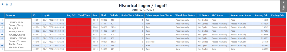 The Logon/Logoff Same Day Report table, shown below, displays information about the operator logons/logoffs: Operator name, ID, Log On/Log Off times, Total Time logged in, Run, Block, and vehicle number along with the pre-trip statuses that occurred during the current day of service, starting at the property’s service day start time.