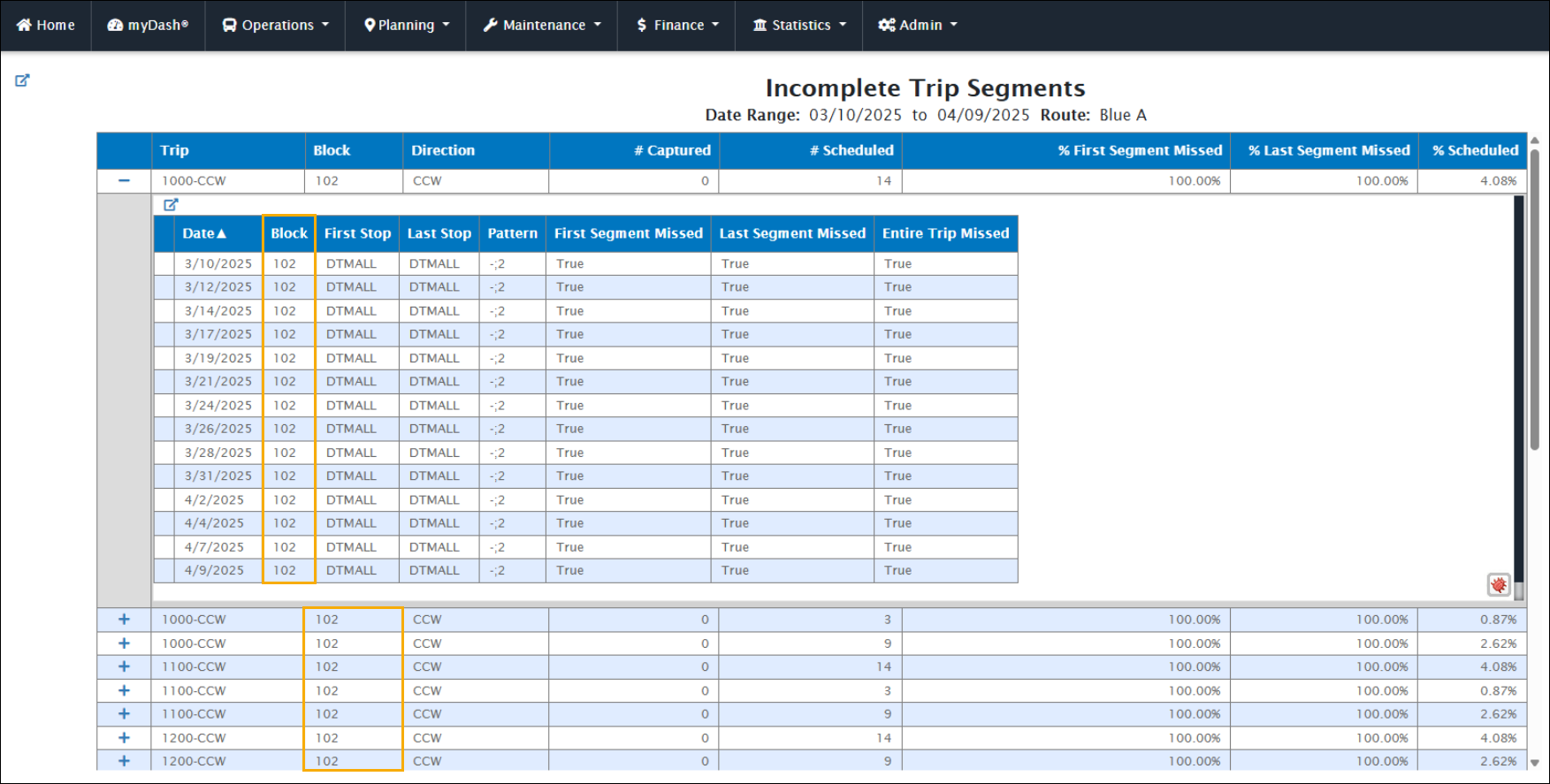 A Block column has been added to the Incomplete Trip Segments, Incomplete Trip Segments by Day, Incomplete Stop Segments by Day, and Incomplete Timepoint Segments by Day reports. This column helps users more easily identify related trip details, such as the driver or adjacent trips.