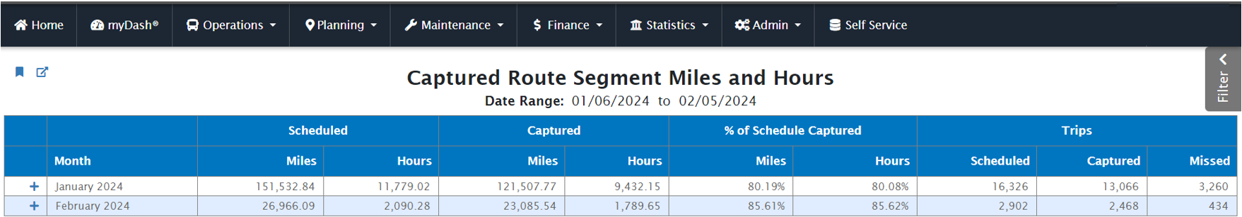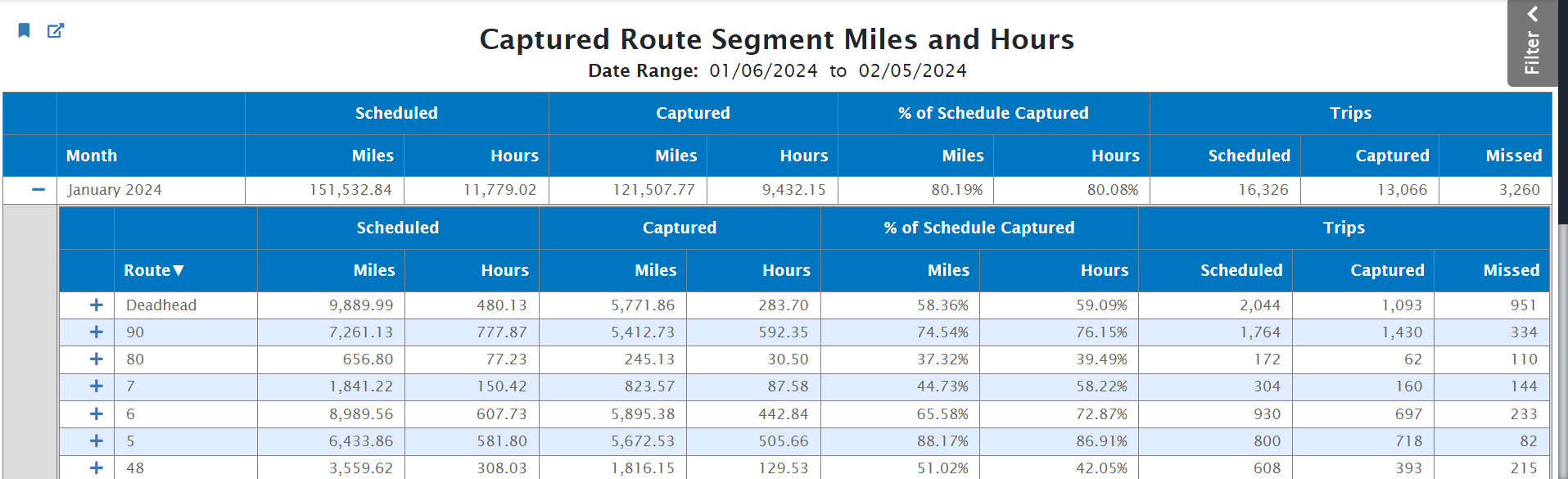 If your property does not have a very high data collection rate (i.e., many missing stop reports), this report will not accurately represent actual miles and hours. TIP: We recommend a review of the Schedule Health report to analyze where service has been missed. Schedule Health includes missed stops, missed time point segments, and missed trips for all scheduled routes. The Schedule Health report is located in the Planning reports section of BI.