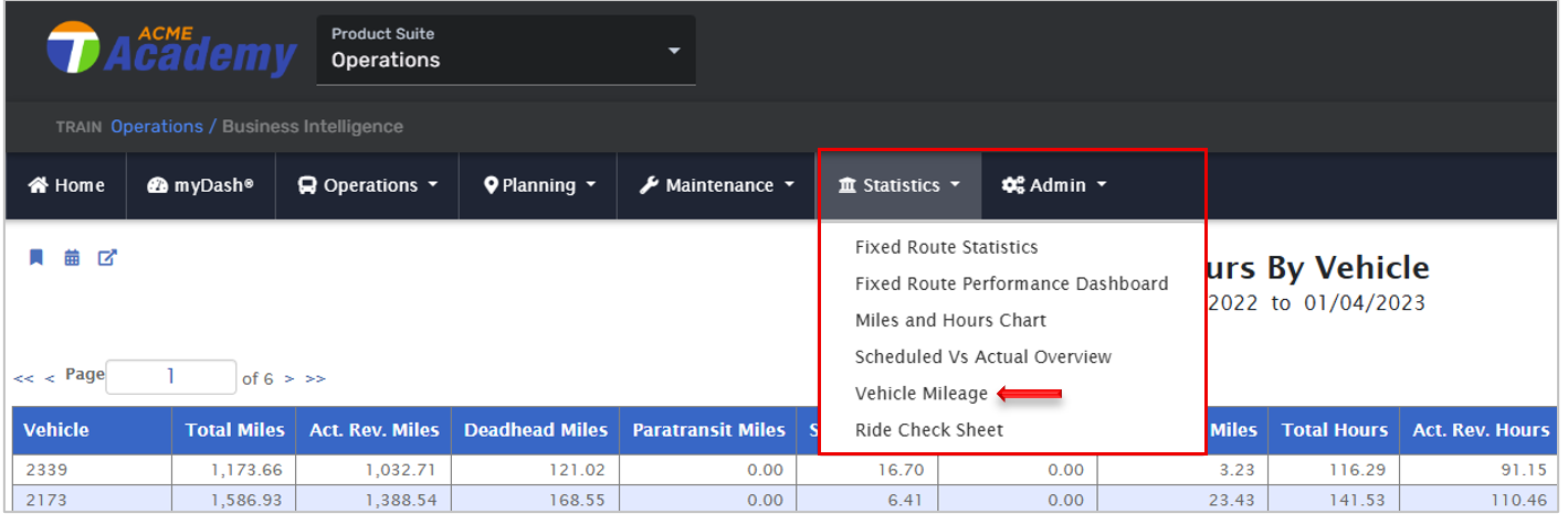 This report displays vehicle GPS odometer miles and compares them against a secondary reporting source, which can be fuel island readings, if integrated with EAM tools in ETMS. The report classifies the GPS odometer miles into the categories. It displays the number of total miles and hours each vehicle has traveled during revenue service . The report displays data for a default date range. Additionally, the report breaks down the mileage and hours by type, such as revenue, deadhead, paratransit, special, and so on.