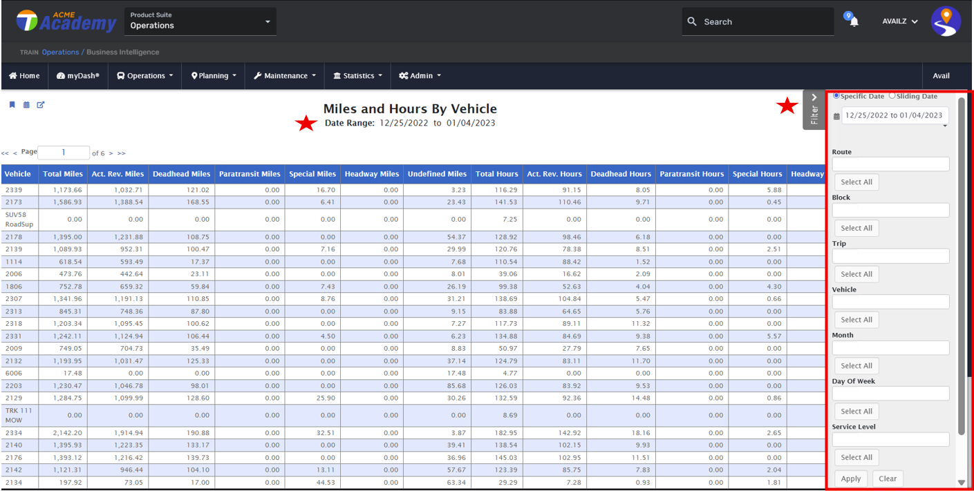 Use the filter pane to adjust the values. Maybe you'd like to review information by Block (vehicles 'follow' the block in the schedule), or by Service Levels. Maybe you have questions about undefined miles and hours? Review each vehicle's miles and hours collection to assist with overall reporting metrics and needs. This report can assist with identifying issues with driver logins, and off route conditions, bus retirements, bus buys, PM needs, and more.