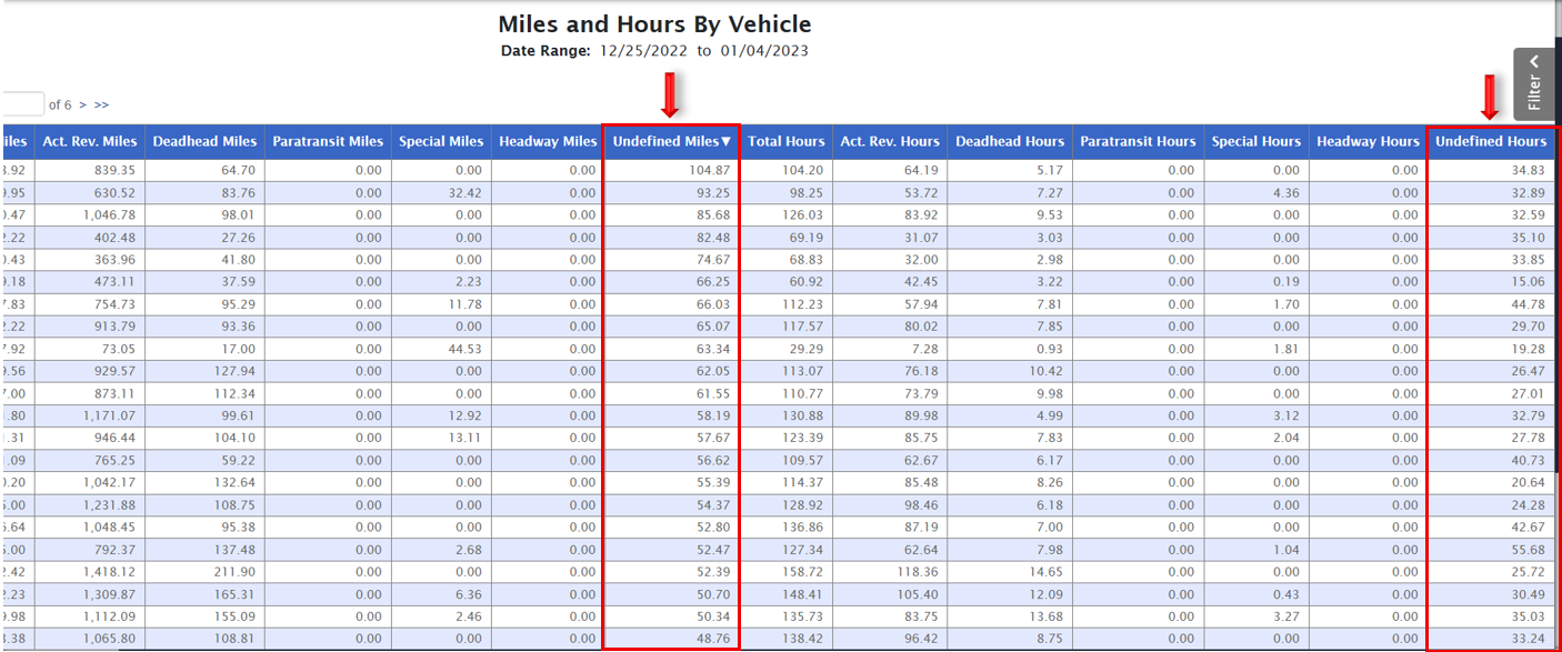 Sort on Undefined Miles or on Undefined Hours to troubleshoot issues with vehicle logins (begins all data capture), schedule adherence and off route conditions. Undefined miles and hours are directly attributed to schedule deviation issues which should be reviewed and addressed. Issues may be on the maintenance side at the vehicle-level They may be due to operator practices, undocumented detours, or needed updates in schedule data ( may be attributed to the geofenced areas around stops/planners typically manage these on Geographic Tools in ETMS). In some very rare cases, it may be due to undocumented roads in GIS tools (mapping tools partnerships - new roads, and neighborhoods not yet available on public facing maps).