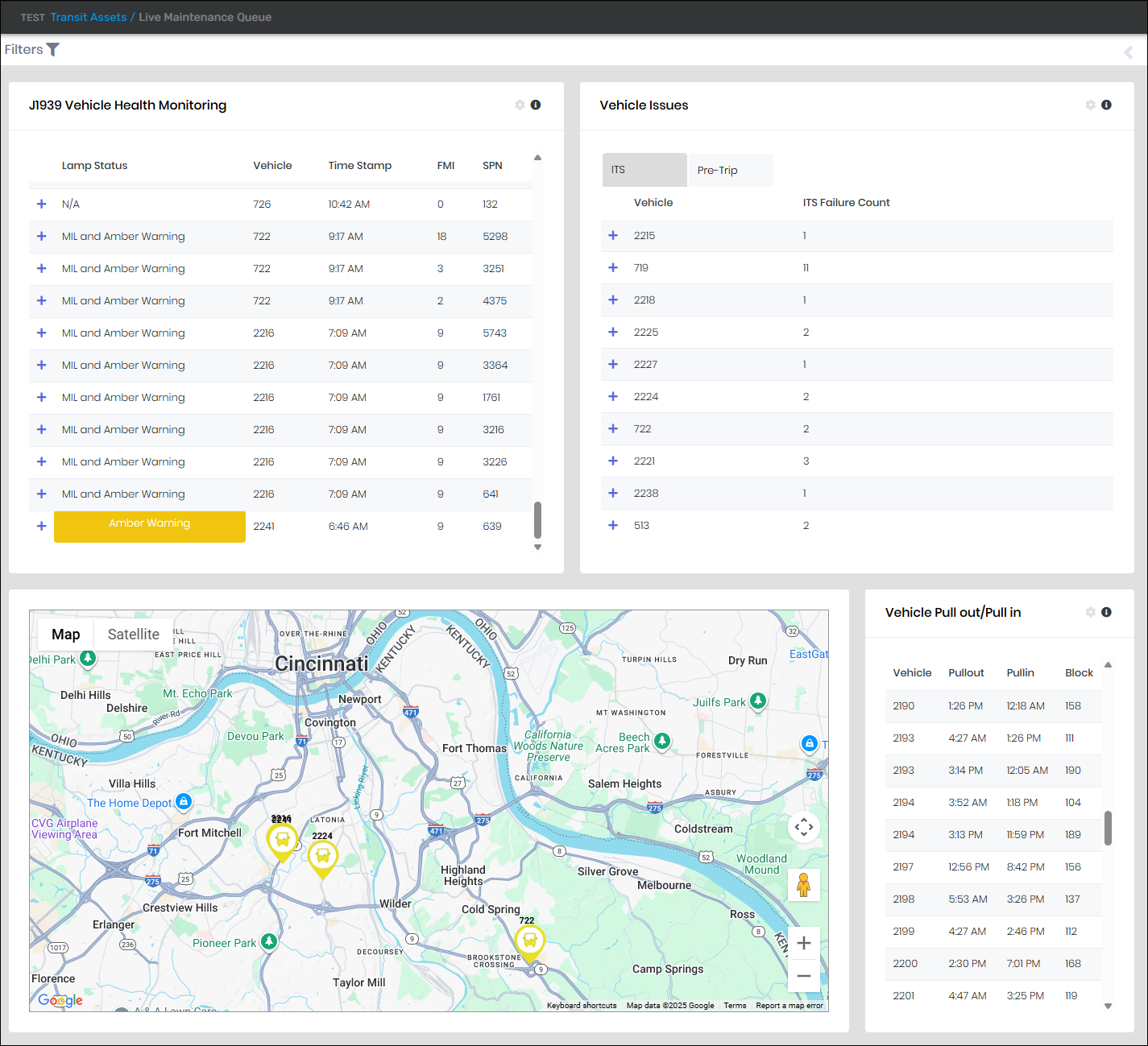 The map shows the location of vehicles with issues and clicking on each will show that particular vehicle information in a tooltip. Each vehicle is color coordinated based on the lamp status.
