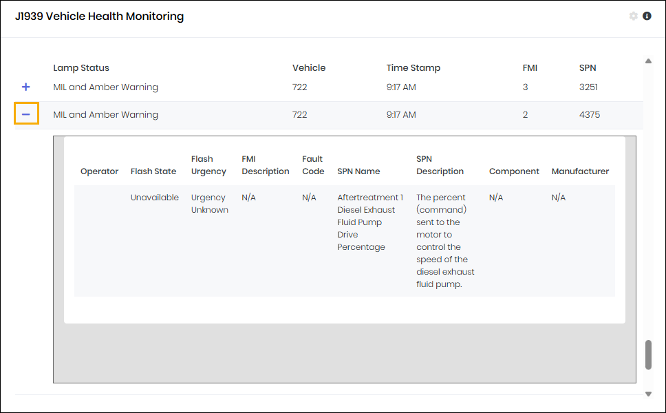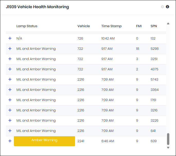 The J1939 Vehicle Health Monitoring card provides a tabular display of the vehicle health monitoring (VHM) messages generated from fleet vehicles equipped with Avail's VHM solution. It displays such issue information as Lamp Status, Vehicle, Time Stamp, FMI, and SPN. Clicking the plus icon expands a row to show detailed information.
