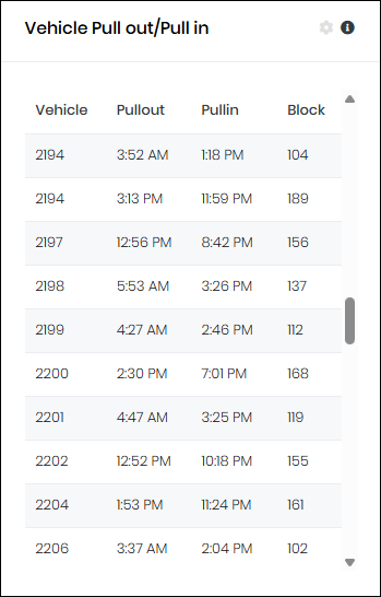 The Vehicle Pull out/Pull in card allows maintenance staff to quickly identify when a vehicle will be departing and returning to the garage to determine if a repair can be done prior to vehicle pull out or be delayed until the vehicle returns as scheduled.