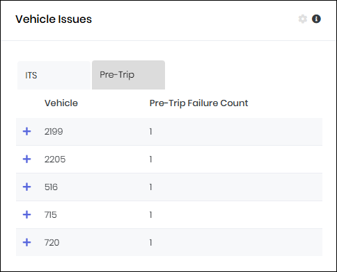The Vehicle Issues card displays ITS and Pre-Trip failures for vehicles. Clicking a tab changes the table view to the respectively-clicked tab. Clicking the plus icon expands a row to show detailed failures for the vehicle.