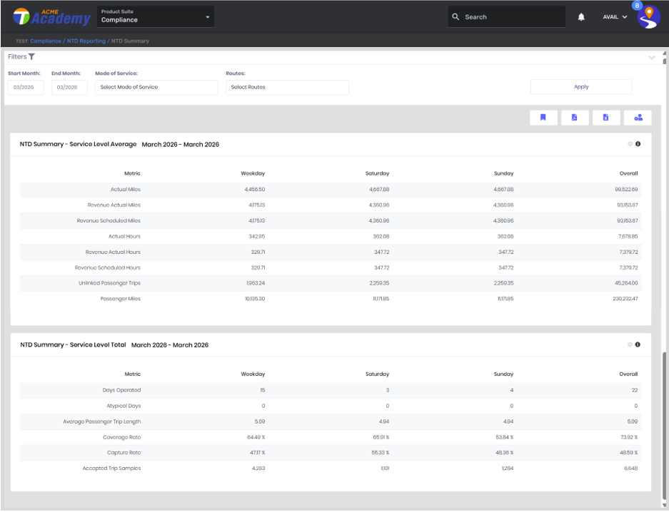 The NTD Summary report shows two sub reports: Service Level Average and Service Level Total. The Service Level Average report provides transit agencies many of the service supplied and service consumed values required by the S-10 Service Module reporting. These values include scheduled vs. actual miles and hours, unlinked passenger trips, average passenger trip length, and more.